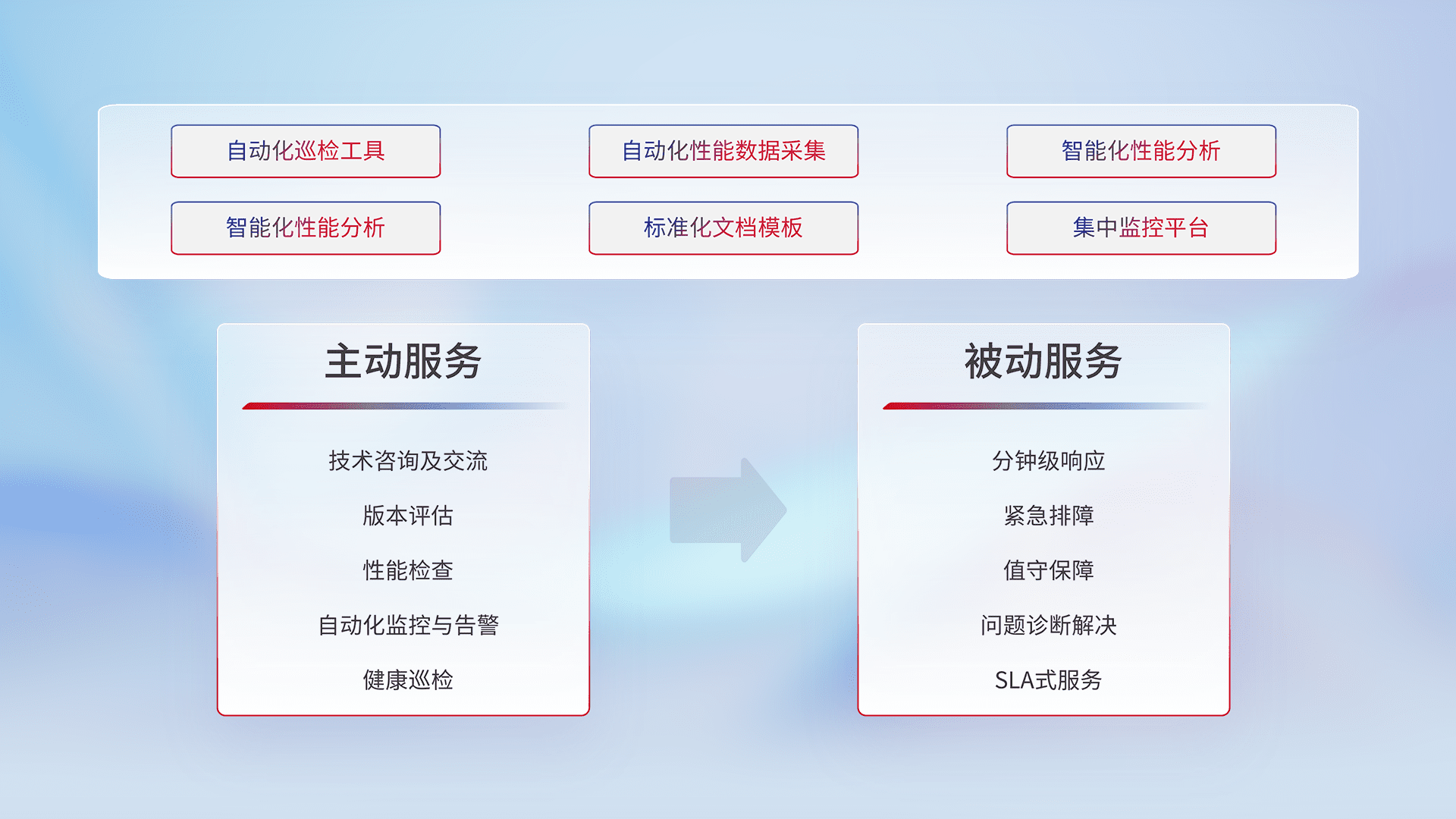 智能化工具和标准化文档,,,保障服务质量,,,,提供主动服务(包含技术咨询、、、、版本评估、、、性能检查、、自动化监控与告警、、、、健康巡检)和被动服务包含(分钟级响应、、紧急排障、、、值守保障、、问题诊断解决、、、SLA服务)。。